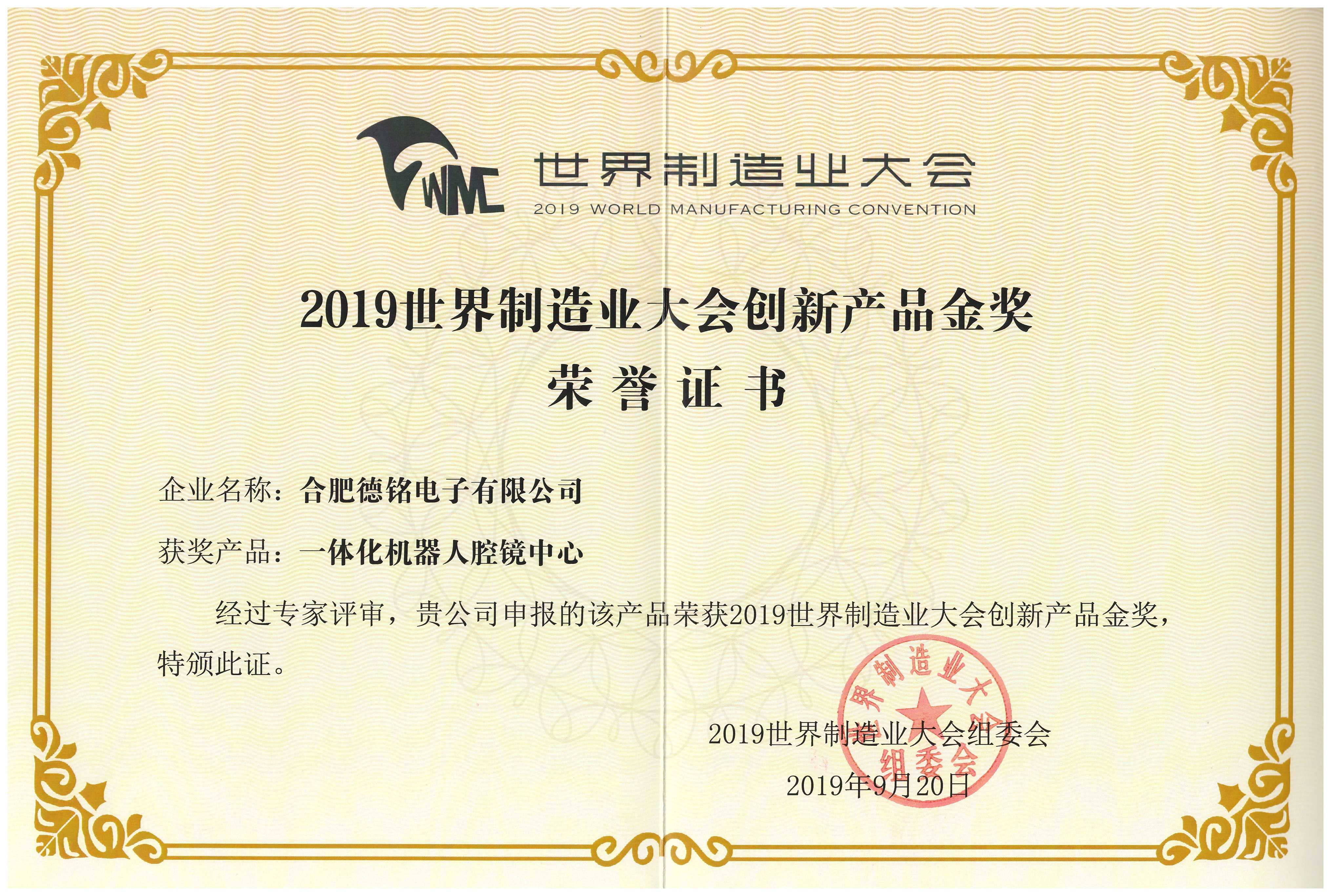 2019年世界制造業(yè)大會(huì)創(chuàng)新產(chǎn)品金獎(jiǎng)榮譽(yù)證書
