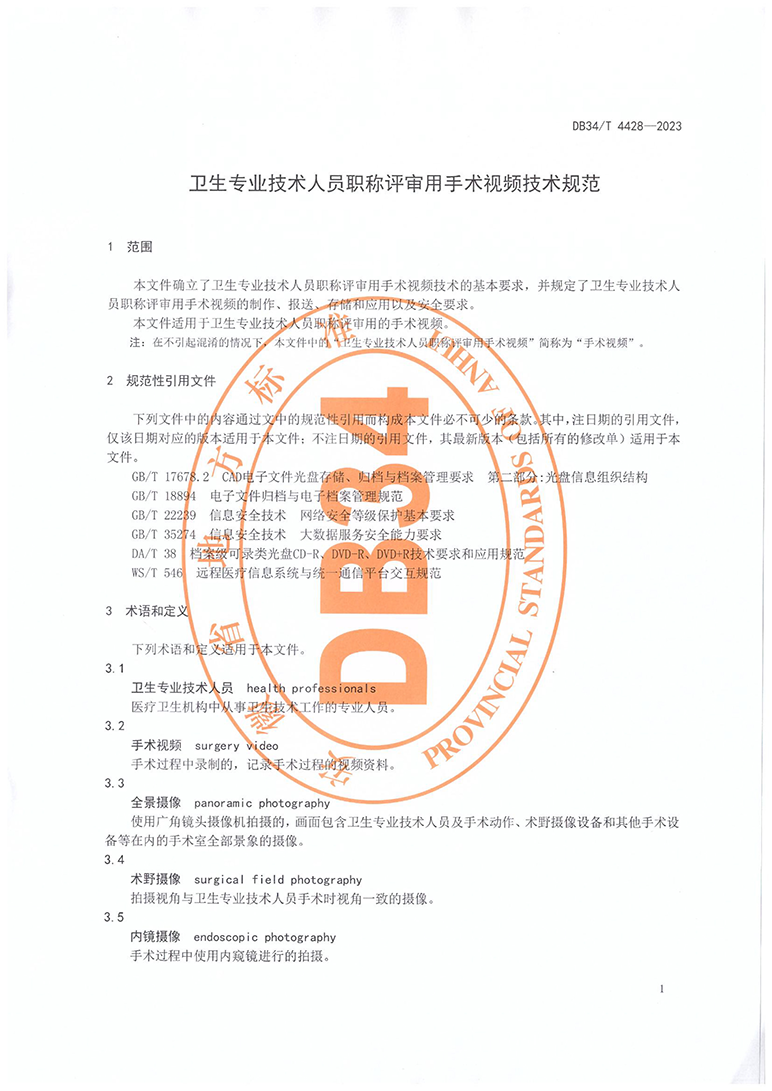 《衛(wèi)生專業(yè)技術(shù)人員職稱評(píng)審用手術(shù)視頻技術(shù)規(guī)范》是為了貫徹落實(shí)《關(guān)于深化衛(wèi)生專業(yè)技術(shù)人員職稱制度改革的指導(dǎo)意見》(人社部發(fā)[2021]51號(hào))要求:衛(wèi)生系列高級(jí)專業(yè)技術(shù)資格的申報(bào)人員在晉升職稱時(shí)以提交其他成果代表作包括手術(shù)視頻?!缎l(wèi)生專業(yè)技術(shù)人員職稱評(píng)審用手術(shù)視頻技術(shù)規(guī)范》已于2023年4月1日正式發(fā)布實(shí)施,目前正在安徽省各個(gè)地市進(jìn)行宣貫。標(biāo)準(zhǔn)的頒布實(shí)施,將有著重要意義: